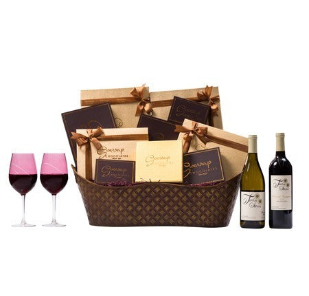Sympathy VIP Wine Chocolate Gift Basket with Designer Wine Glasses