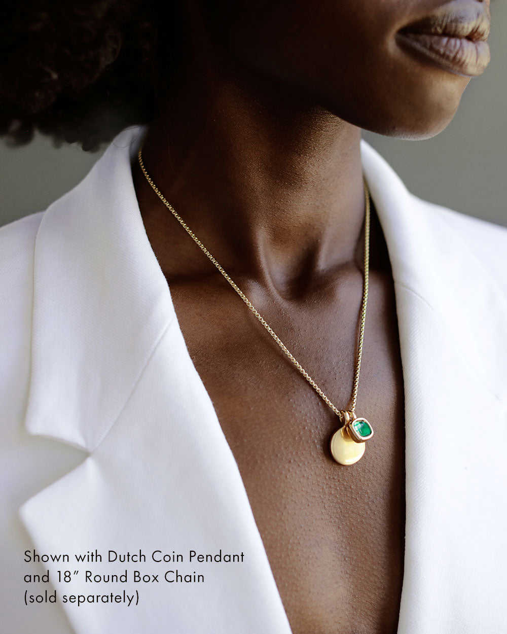 DescriptionA little button of gold, pressed in the center and made into a merry pendant.This special piece has the signature softness and thickness of our entire Button Collection, with the added pleasure of an overlarge bail. Small, yet mighty.The finely crafted bail is not only delightfully proportioned, it can accommodate a chain without the need of a jump ring, offering a more streamlined and solid feel. This pendant is one youll never want to take off.Round box chain sold separately.DetailsCast in solid 18k yellow gold (not hollow)~7.5mm