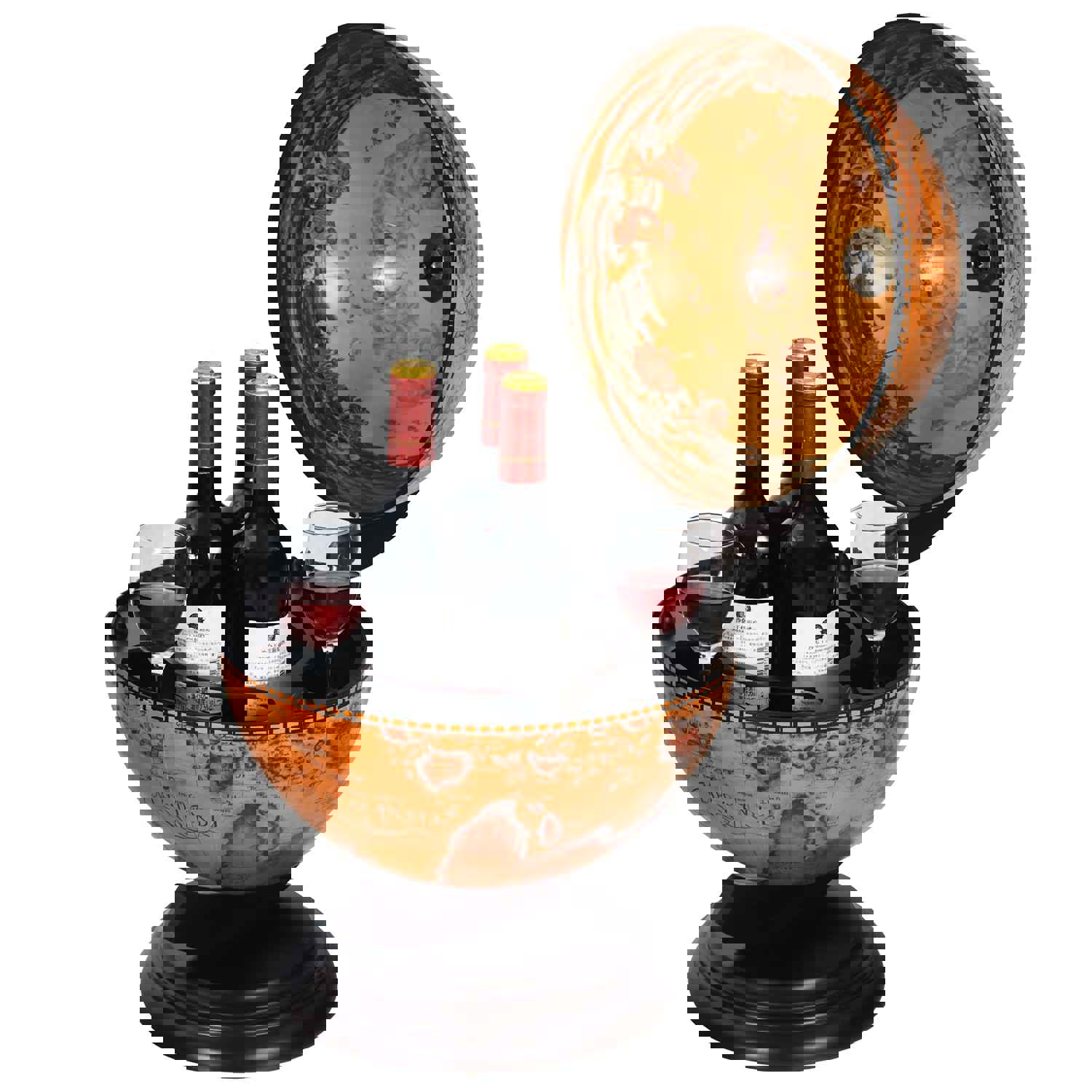 Description This is our wood globe wine bar stand. It is a Italian-Style Globe Wine Rack, which is ideal for Storage wine bottles and glasses. Its unique outlook will bring highlights to your home and shows your lifestyle. This Italian-Style Old World Globe-Style Bar depicts the natural world upon a deep wood background . The Globe Bar opens to disclose a large rotating bar with plenty of room for your favorite spirits and crystal stemware. It will look superb in any formal setting, while fulfilling a useful function with style and grace! There