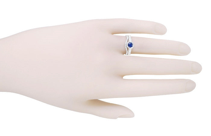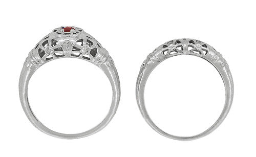 Sure to spoil you for a lifetime, this lavish Art Deco rose gold bridal ring set includes a 1/2 carat engagement ring setting for a round brilliant cut diamond and a matching diamond wedding band. Artisan hand crafted in 14K pink (rose) gold with a 14K white gold setting for the center diamond, this gorgeous wedding ring set features a romantic sculptural scroll pattern on all 3 outward facing sides bordered by light scattering milgrain edging. Set with 14 shimmering round brilliant cut diamonds of F/G color and VS clarity for a total of 0.30 c