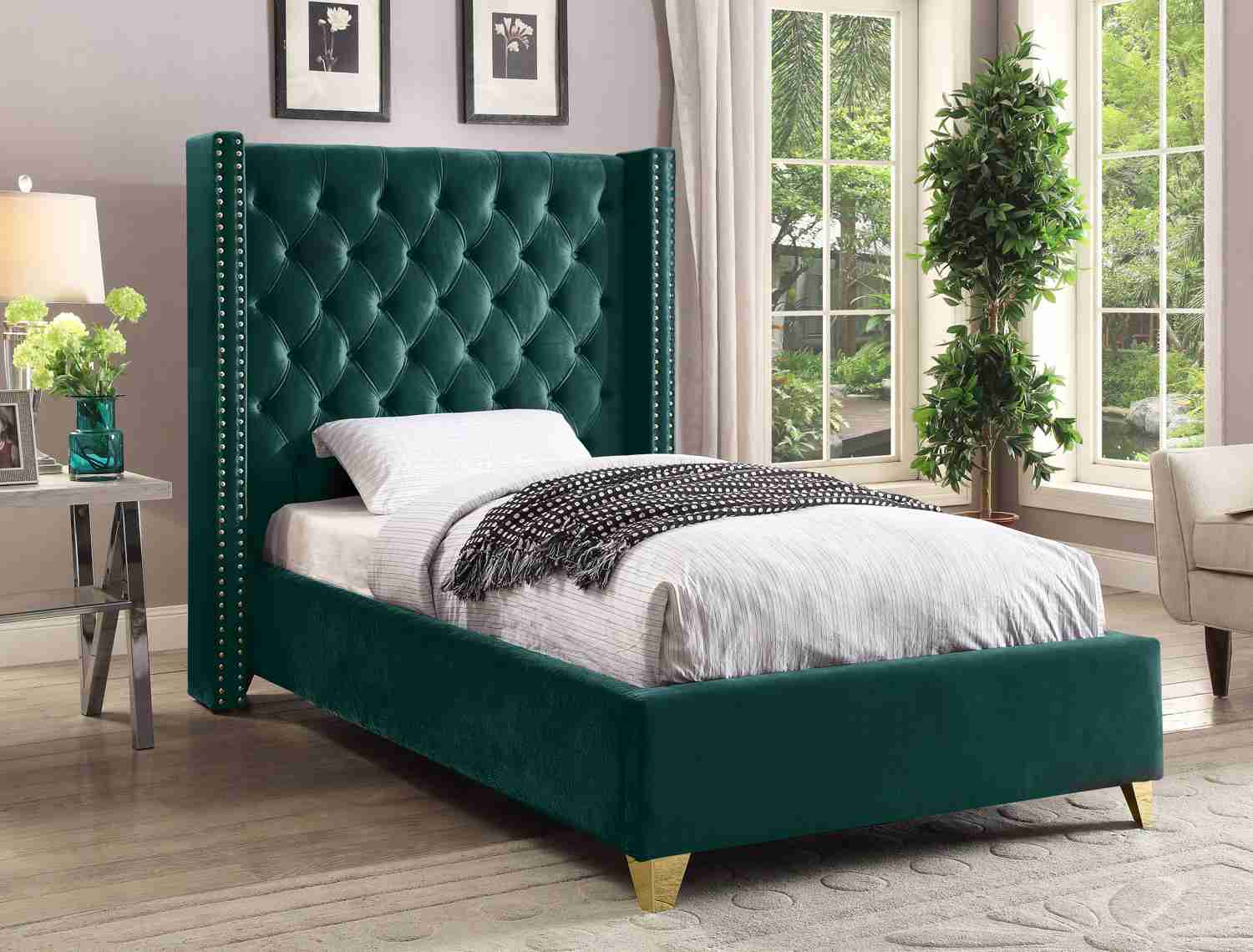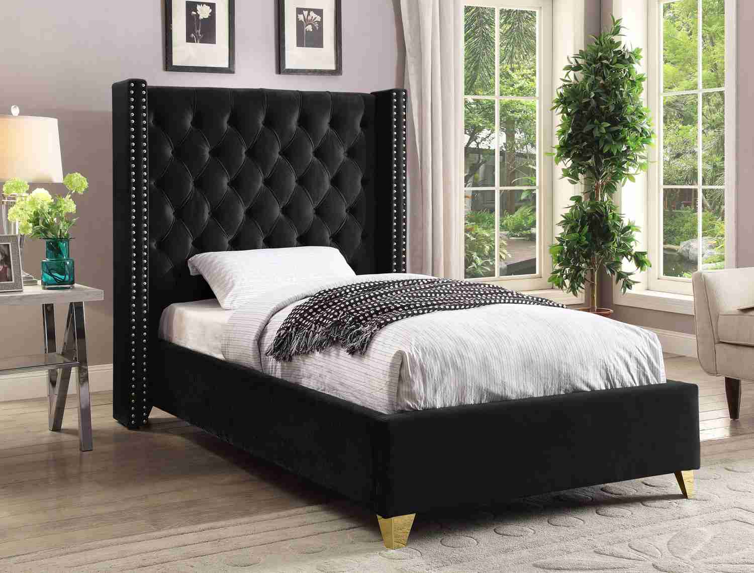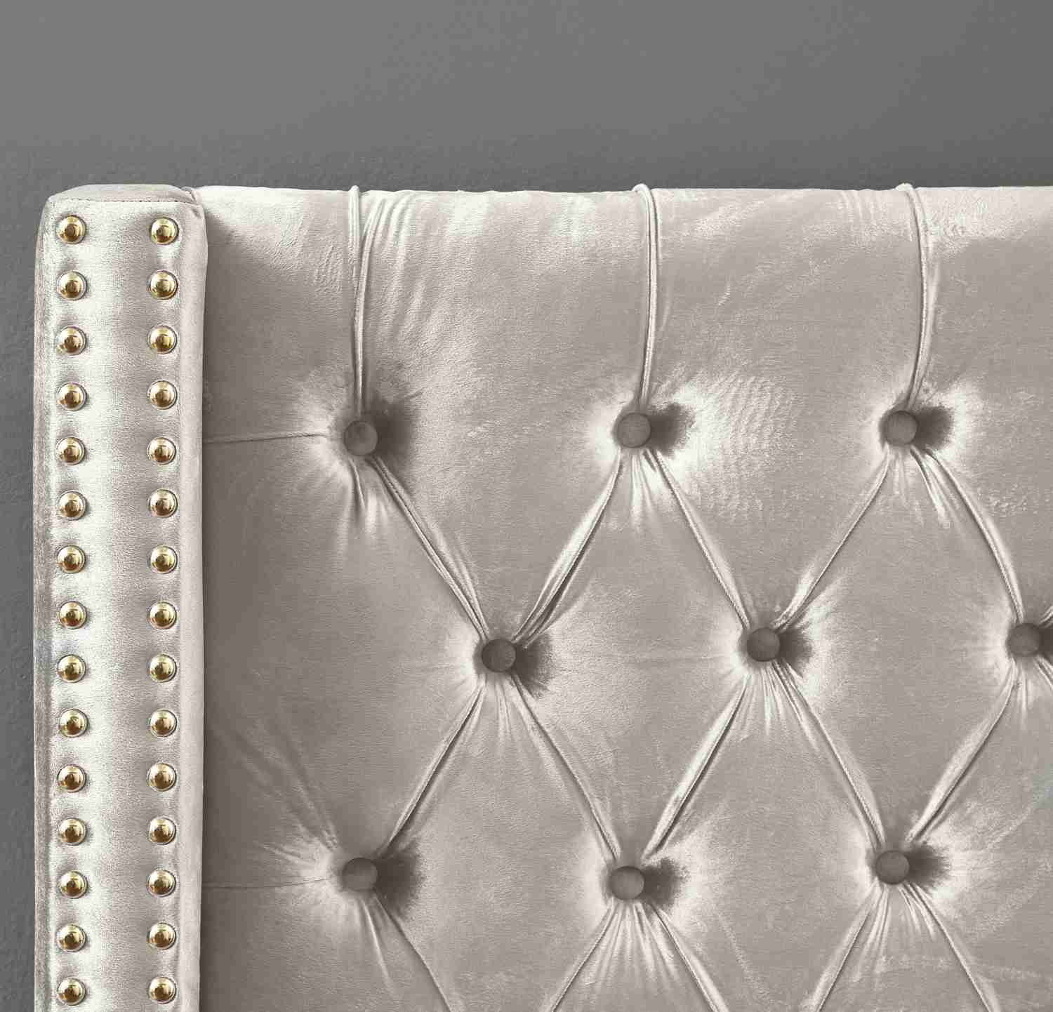Elegant and eye-catching, the stunning Barolo Bed from Meridian Furniture is the perfect addition to any bedroom. Rich velvet covers the deep tufted design. A beautiful wing bed design is complimented by hand applied gold nail head details. Strength and beauty is guaranteed with a solid wood frame and stainless steel legs.- Pink Velvet Fabric- Deep Detailed Tufting- Gold Nailheads- Gold Legs- Wing Design- Full Slats (Box Spring Not Required)- Footboard Height 14
