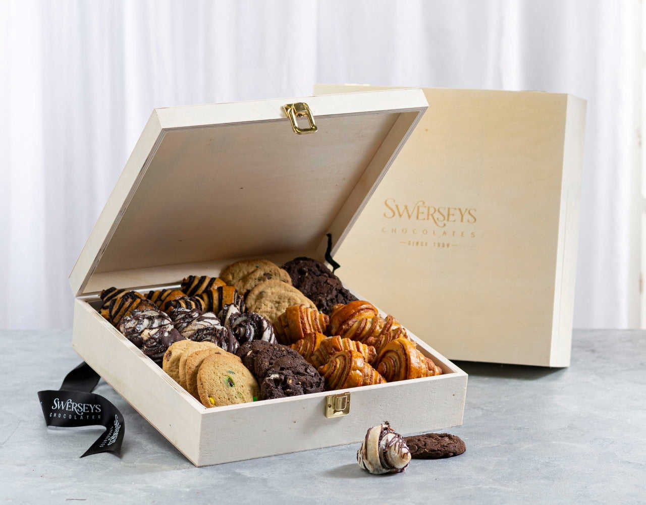 Celebrate any occasion with this designer wood chocolate tray and wine gift set. This stunning tray is loaded with a variety of milk and dark chocolate, chocolate covered nuts, creamy centers, sea salt caramels, Jordan crackers, and our signature peanut butter cups.Youll also get to enjoy two bottles of Bartenura wine, a Moscato and a Brachetto, that pair perfectly with the chocolate. This gift set is the ultimate indulgence for any chocolate and wine lover. Whether its a birthday, anniversary, thank you, or just because, this gift set will m