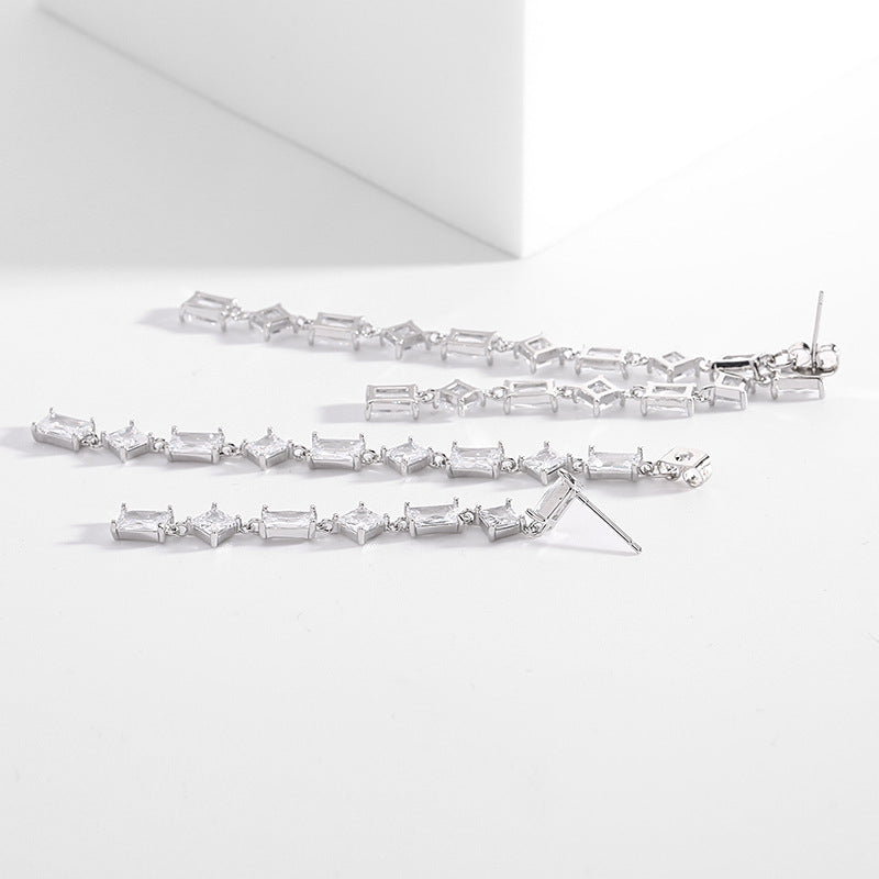 Raw material: Copper , Man made CZ, S925 Silver Size: 0.39”x1.69” Weight:18gThis pair of embellishment faceted rectangle shaped drop earrings in silver tone plated , clear cz surrounded faceted rectangle stone stud , rectangle stones linear and prong setting work drop to make a rectangle shape drop with clear cz studded .We also prepare pink and light blue rectangle stone drop earrings for matching your different look
