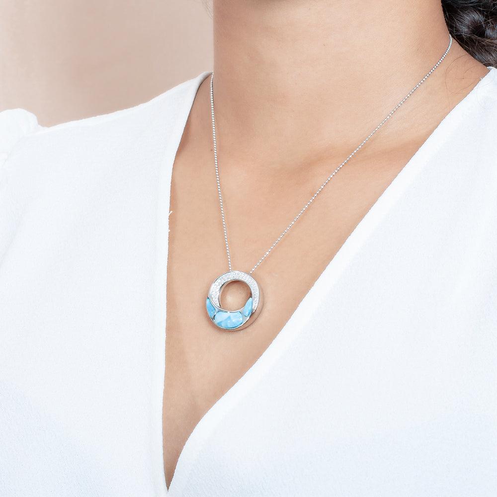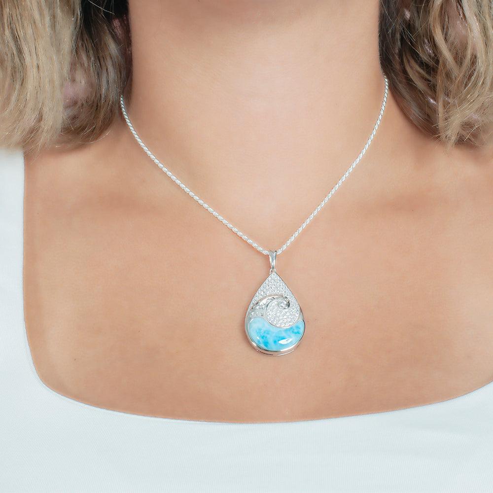 This 925 sterling silver teardrop pendant features hand-selected Larimar gemstones and white topaz.Embrace the luxurious allure of the ocean with our stunning Larimar Divided Waters Pendant. Every teardrop is a tribute to the oceans majestic beauty, capturing its vibrant hues and tranquil rhythm in a wearable piece of art. Dive into the luxury of natures beauty with this exquisite pendant. #LarimarLoveThe teardrop shape of this piece emphasizes that water is our life-force- oceans, rain, and our joyful tears are water. The perfect gift to sho