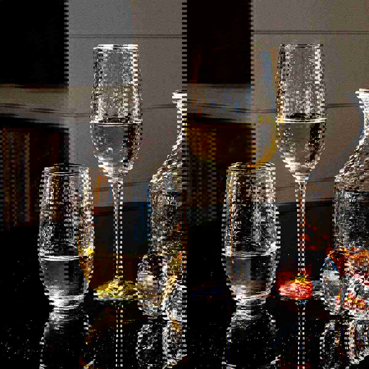 This subtly shimmering and textured collection is crafted of sturdy mouth-blown glass to help you celebrate lifes simple pleasures, like the perfect pairing of your favorite pinot noir with a hearty beef bourguignon.Measurements: 3.5W x 8.5H x 3.5LMade in: ThailandMade of: Glass