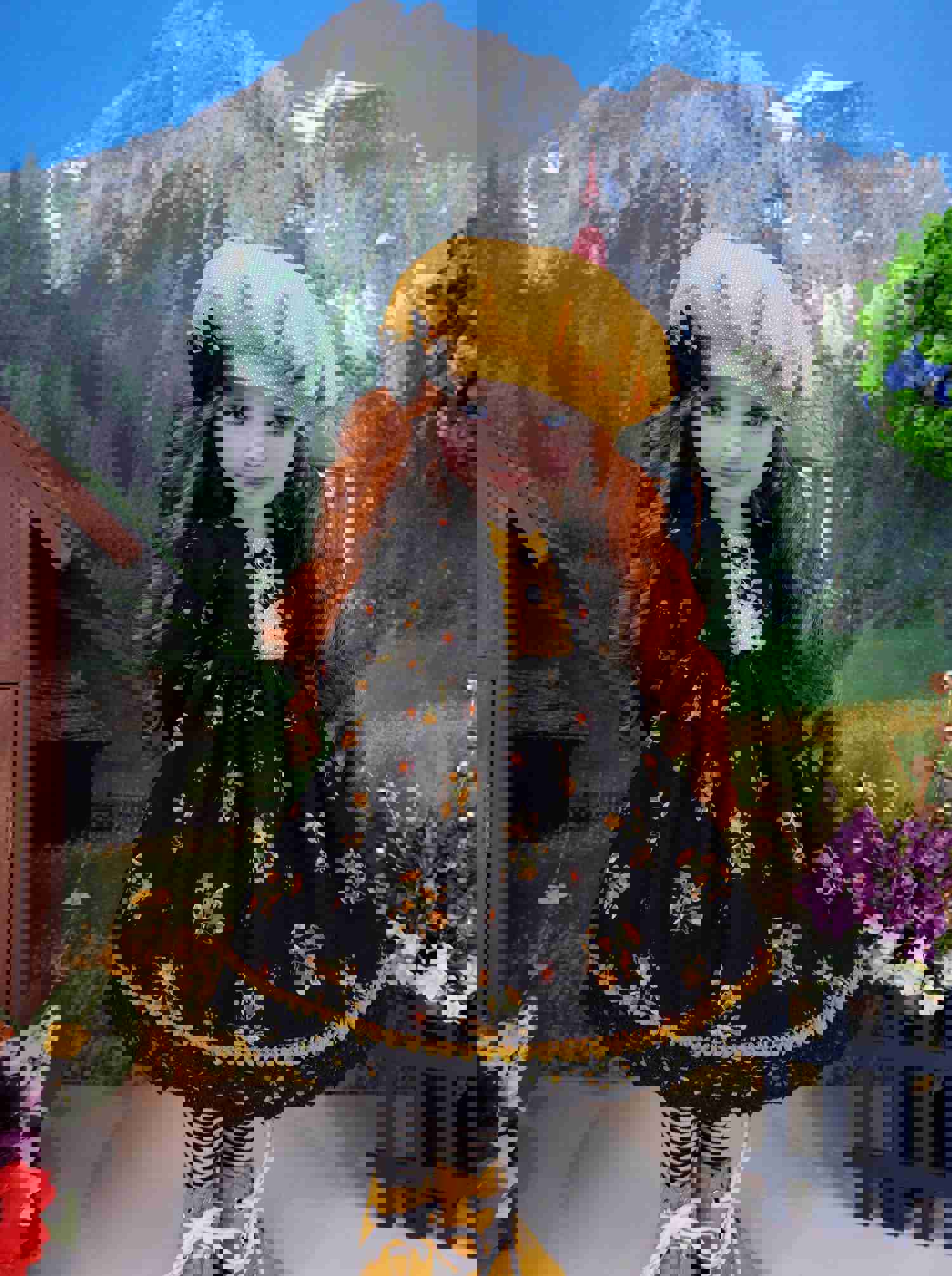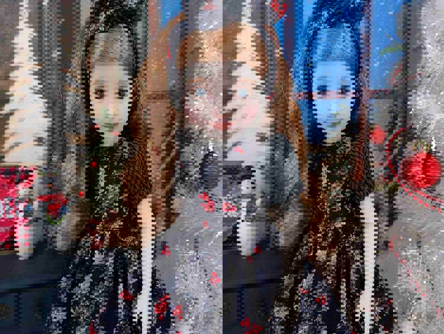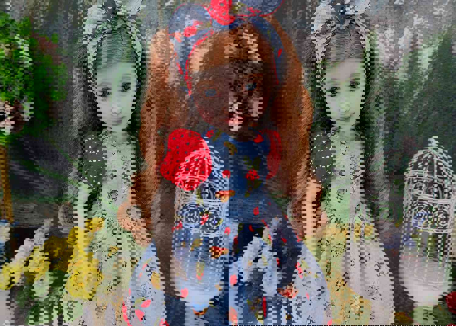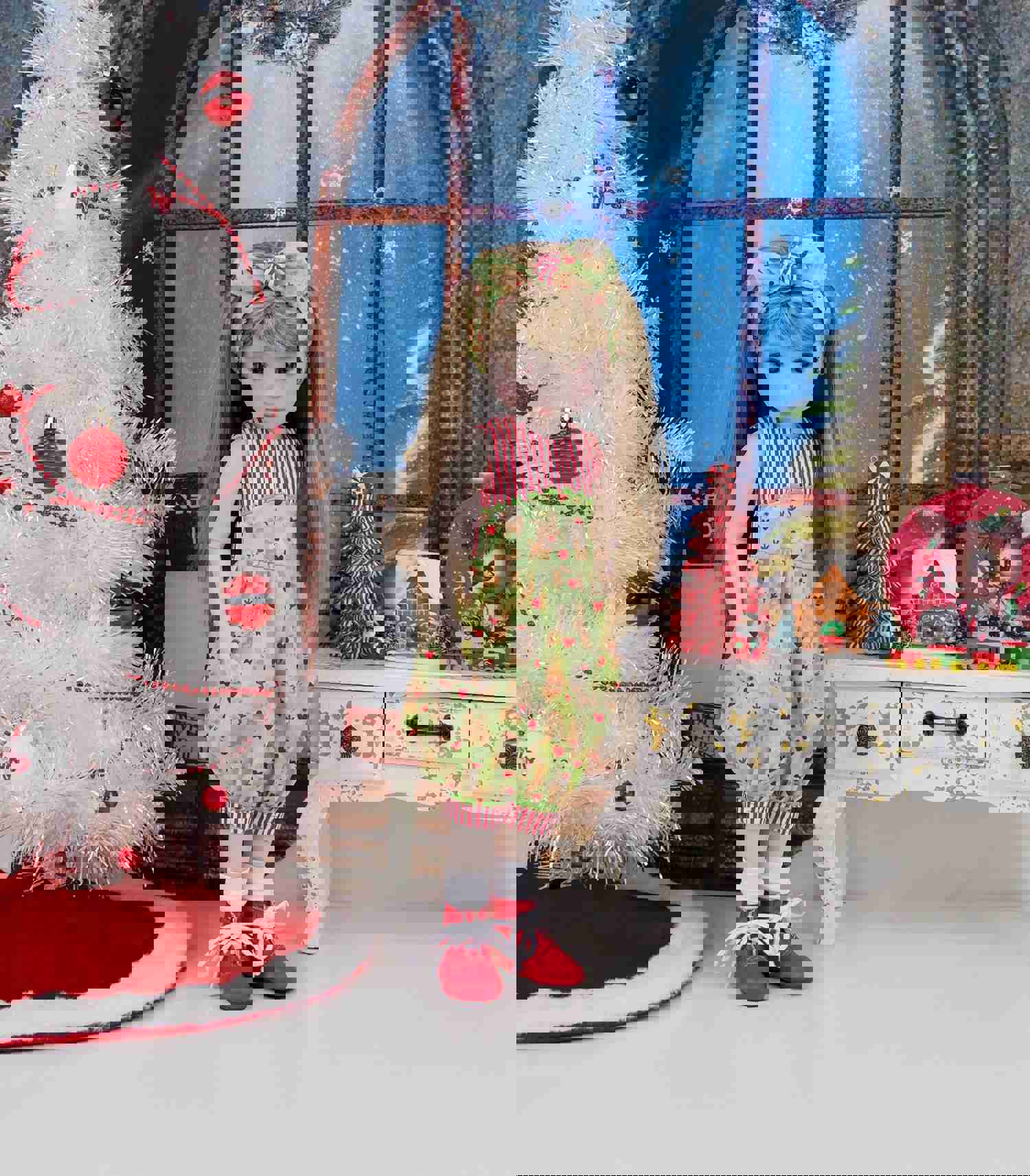 This beautiful ensemble will make a great addition to your Fashion Friends closet for this winter. The dress is made of a pretty grey pine cone with pink and aqua presents scattered about on ivory cotton. The bodice is fully lined with long, full length contrast pink polka dot print sleeves featuring a bit of elastic at the wrist. The skirt is gathered at the waist for a pretty silhouette with pink lace over grey crochet lace peeking out beneath the hem. The dress fastens in back with buttons. To add to the charm of her outfit, she has a knit