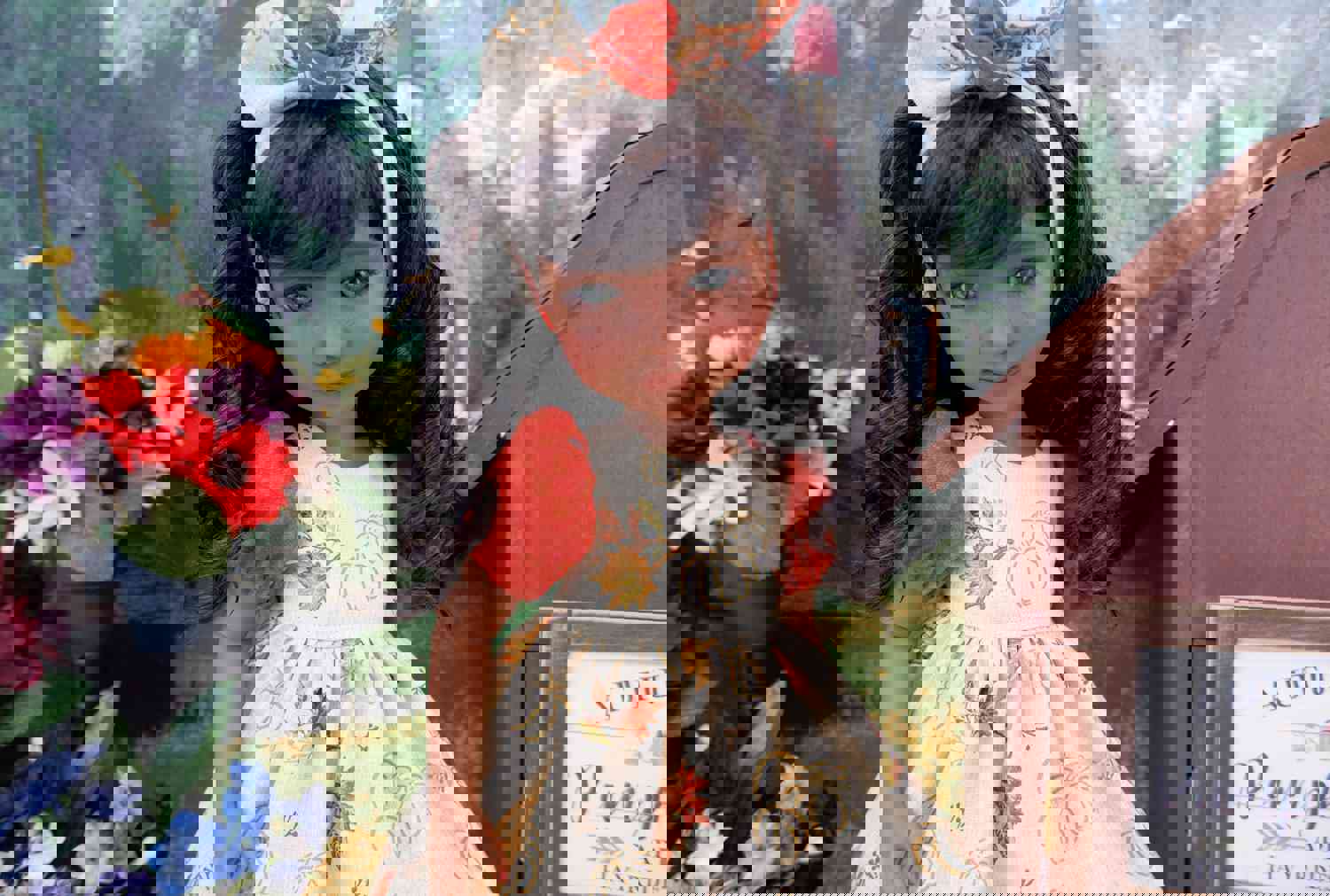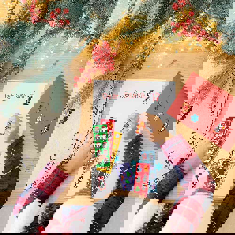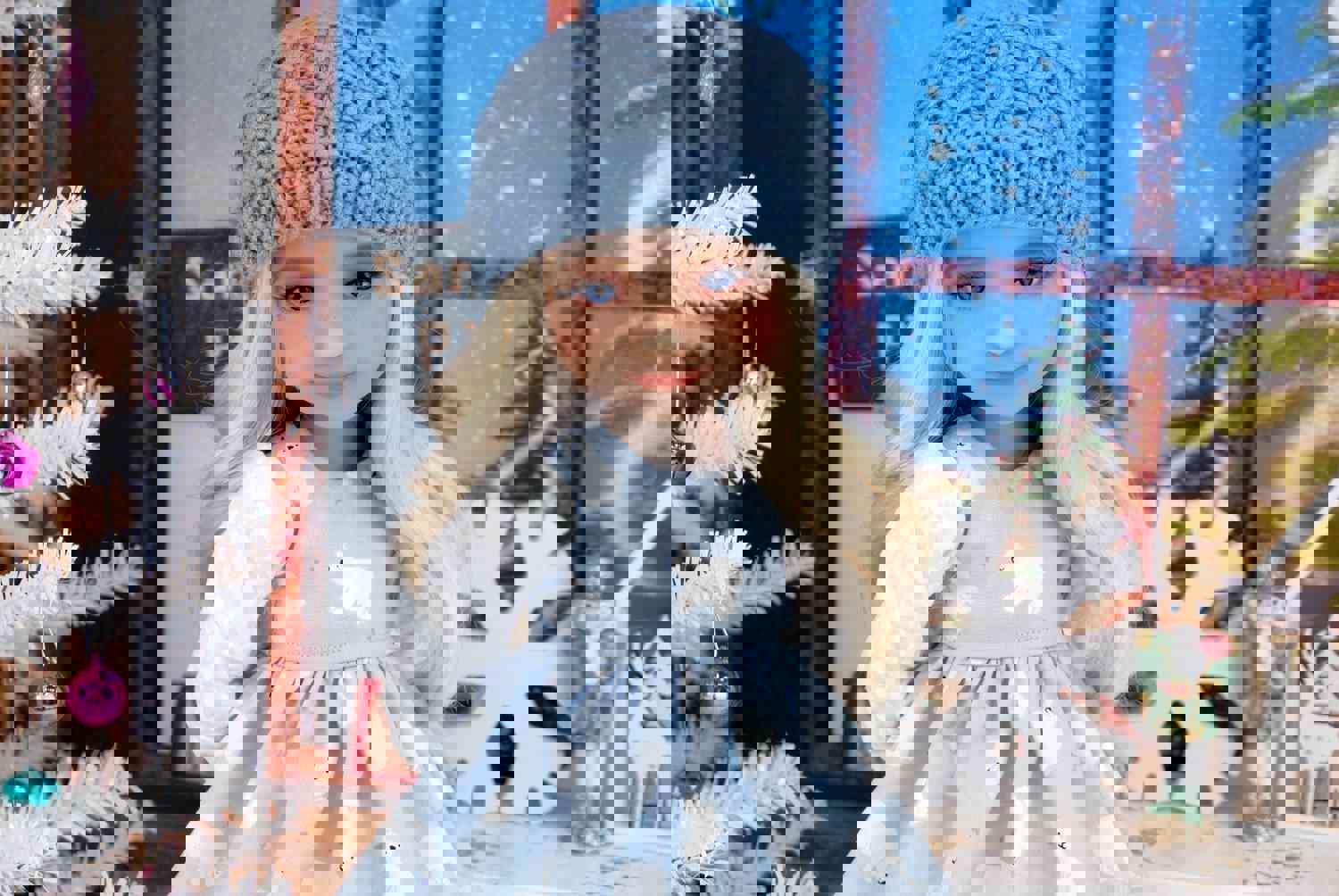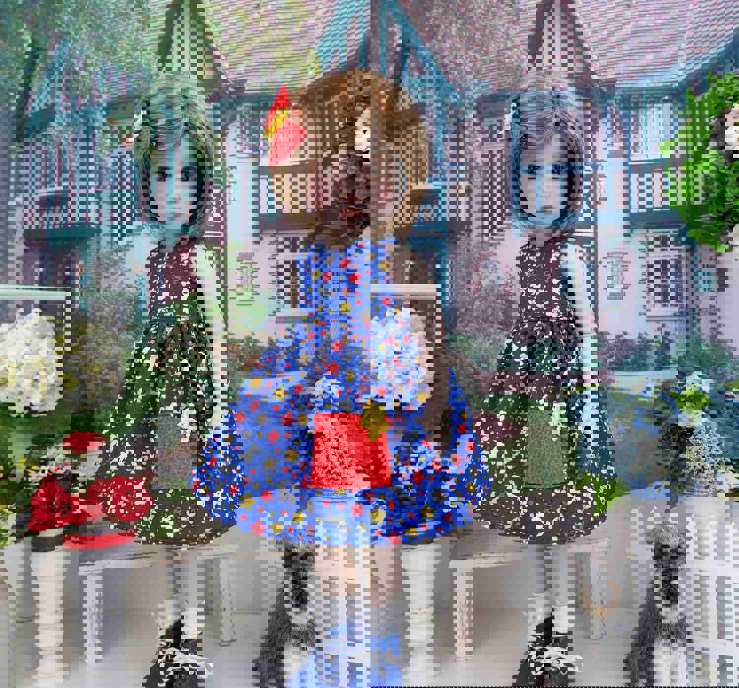 This beautiful ensemble will make a great addition to your Fashion Friends closet for this winter. The dress is made of a pretty grey pine cone with pink and aqua presents scattered about on ivory cotton. The bodice is fully lined with long, full length contrast pink polka dot print sleeves featuring a bit of elastic at the wrist. The skirt is gathered at the waist for a pretty silhouette with pink lace over grey crochet lace peeking out beneath the hem. The dress fastens in back with buttons. To add to the charm of her outfit, she has a knit