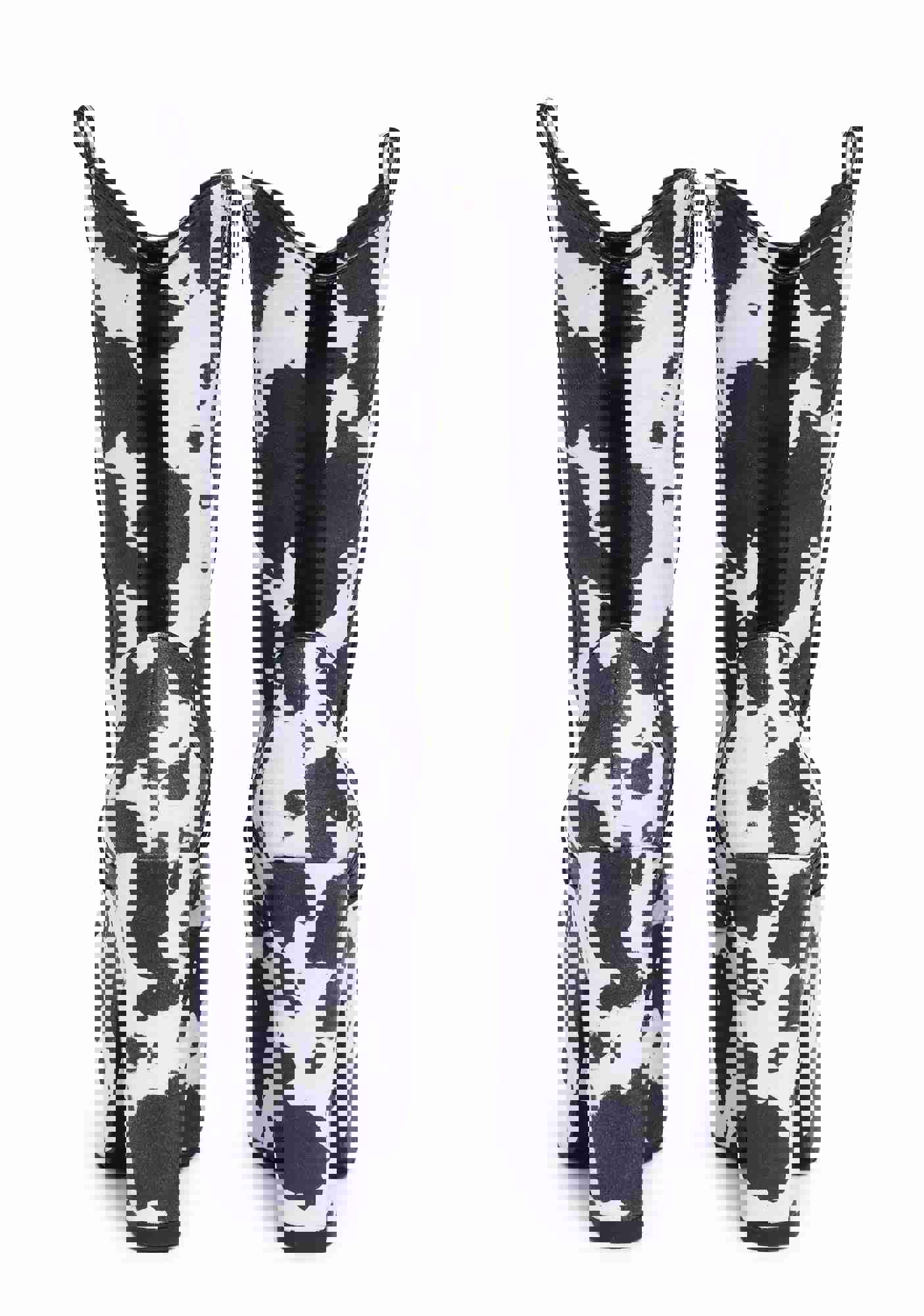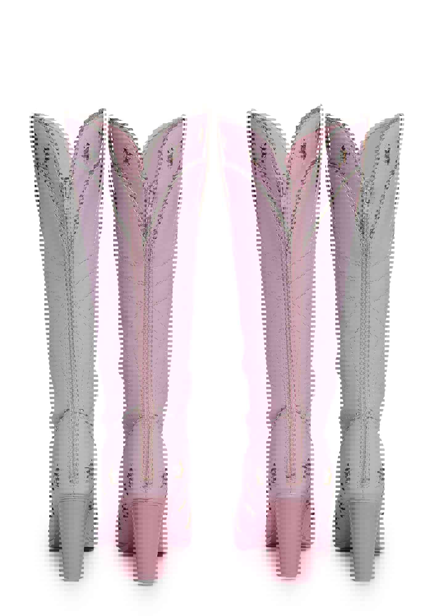 cuz youre out of this world. These boots come in a pearl vegan leather construction, with glitter stars, stitched details, a block heel, and a back zip closure.