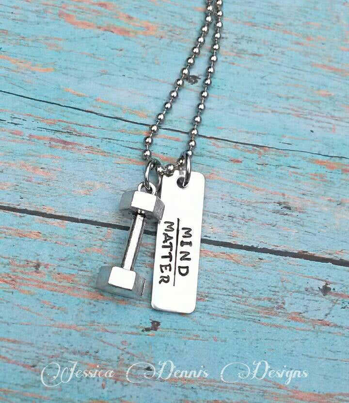 Please see shop announcement prior to ordering, for turnaround time and other important information The 3/4 pewter pebble is hand cast and organic! It is hand stamped with the quote I CAN I WILL or with initial of your choice. Ive also added a barbell charm. The charms grace a stainless steel ball chain. Each pebble is unique in shape and texture. If youd like your initial instead of the quote, or another short quote of equal or less characters, please leave a note in the message to seller box including the customization youd like. Pewter