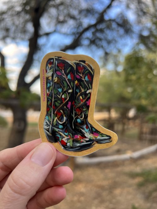 Who doesn’t love a cute pink pair of cowgirl boots? Just sayin’. It’s a vibe.Die-cut vinyl sticker measures 3” x 1.71”. Weather, water, and fade resistant! Great addition to your travel mug, computer, cooler, anywhere your heart desires!Original painting by Sarah Heinbaugh Art