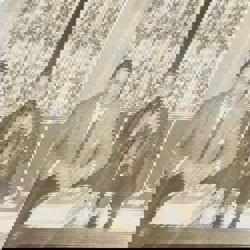 Step back in time with this charming vintage photograph from the 1950s. Captured in a cozy living room setting, the image depicts a family at leisure. A man is seen holding a dog while a girl attentively listens to the radio, and a lady adds to the scene's warmth. This mid-century modern photo is perfect for those who appreciate nostalgic art and decor.