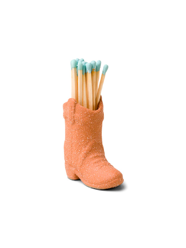This vintage-inspired ceramic cowboy boot match holder includes 25 safety matches that are easily lit with a strike on the bottom of the boot! ✨After the safety matches run out, this holder is compatible with any match and can provide light by striking on the rough ceramic surface. Whether you are daydreaming about being back in the Music City or wanting a Western vibe, these ceramic boot and hat accessories make the perfect gift set or bookshelf accessory. ✦ Match Tip Color: Green.✦ Measures approximately 2.75 L x 1.18 W x 3 H.