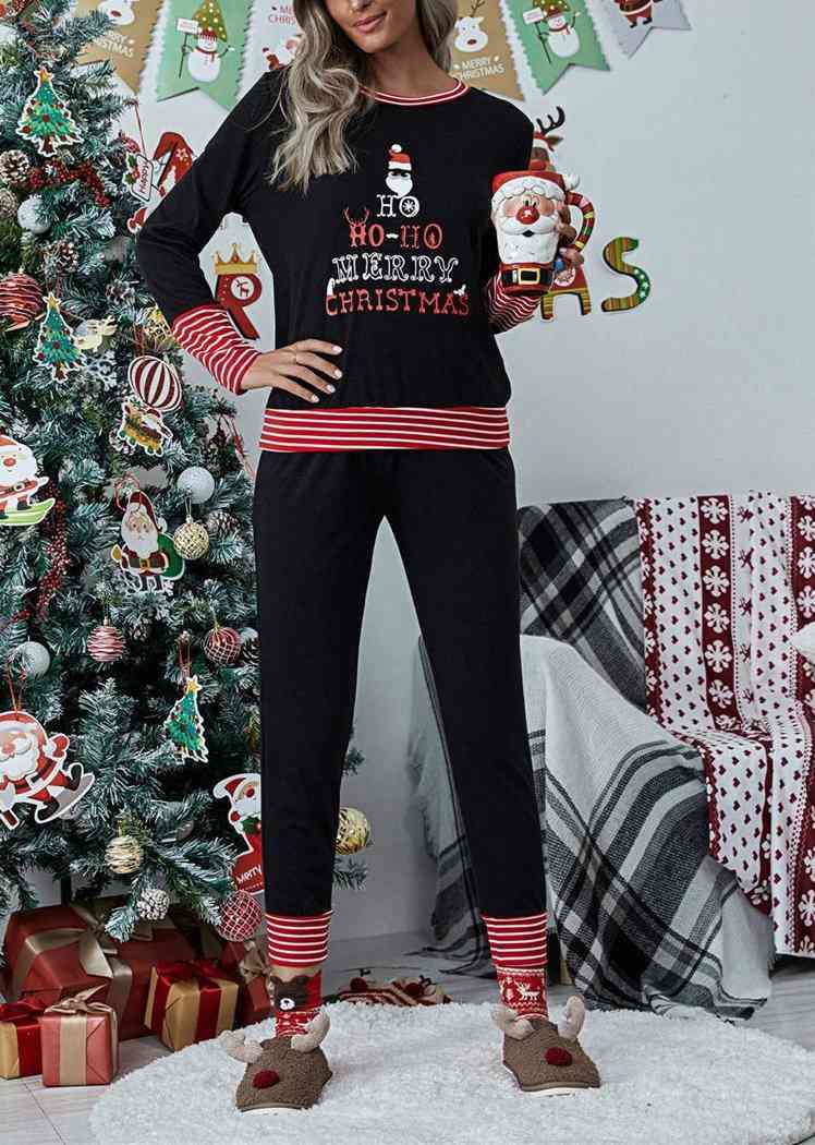 Fashion Santa Claus Christmas Letter Print Stripes Set 2 Pieces Black Christmas Pajamas for Women