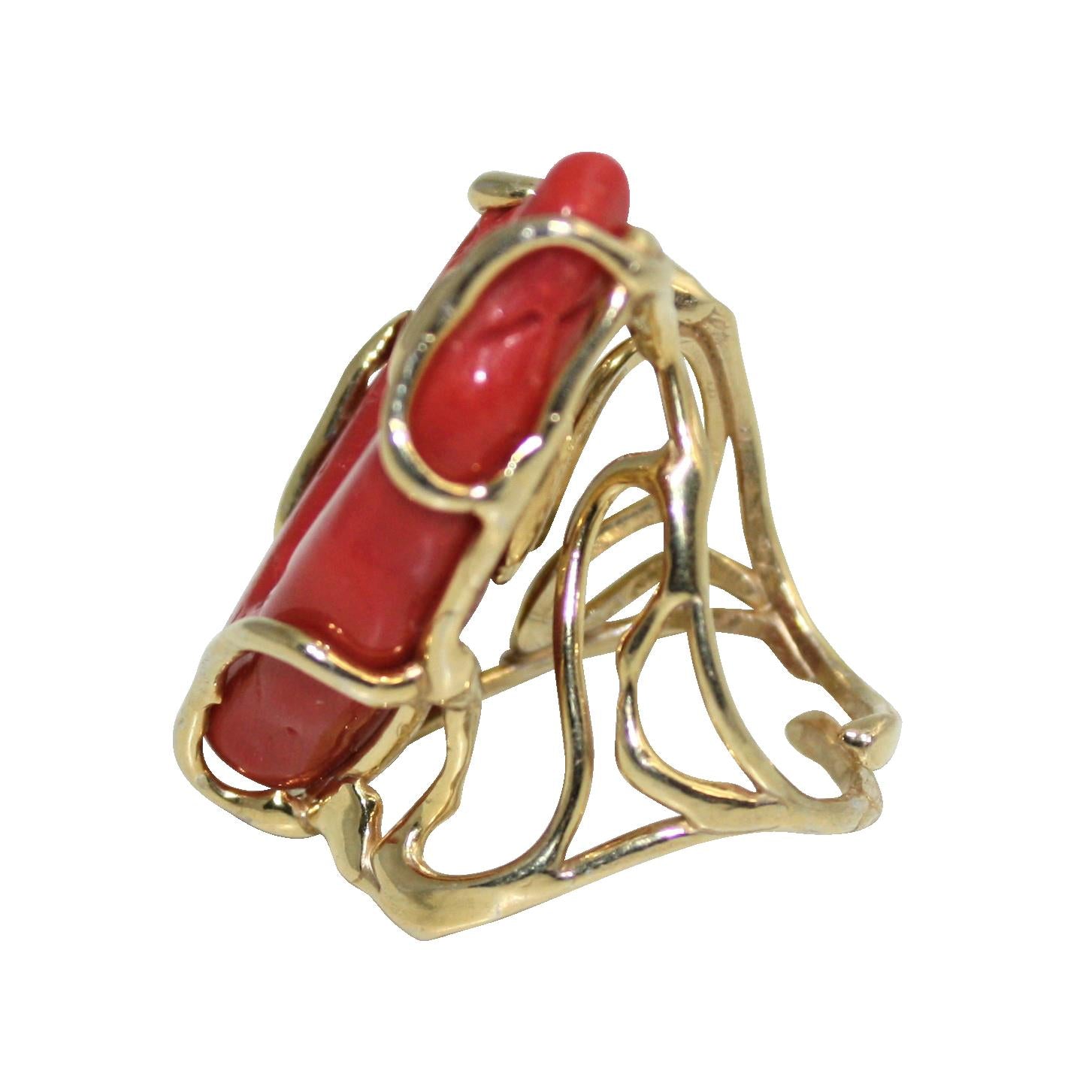 Italian Red Branch Coral Stylish Ring - 18K Gold over Sterling Silver