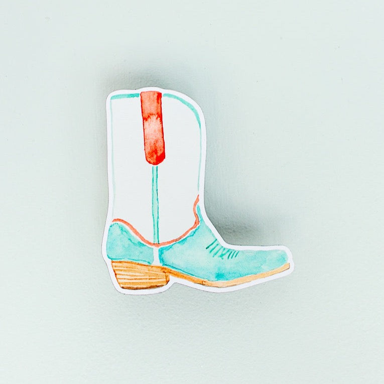 Hand-Painted Teal and Coral Cowboy Boot Waterproof Vinyl Sticker by kathyphantastic