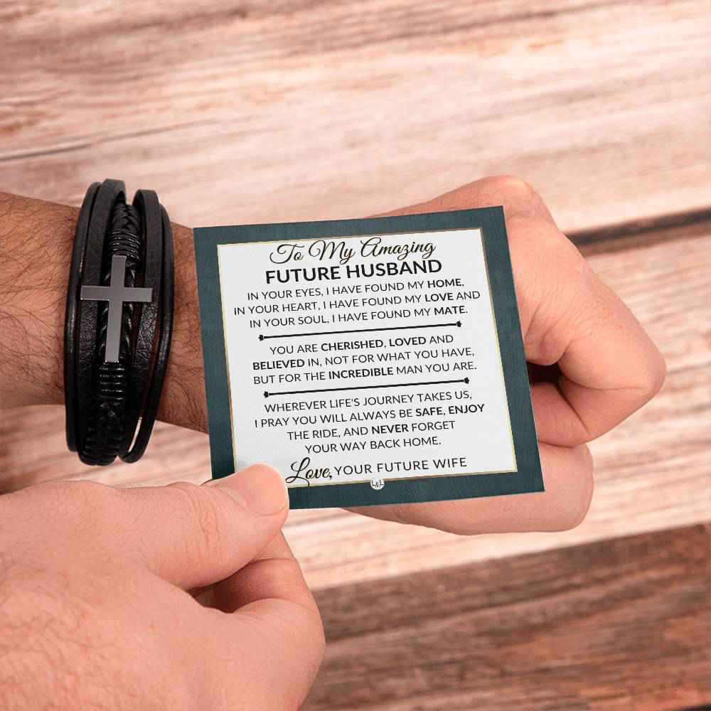Romantic Gift For Future Husband - Mens Braided Leather Bracelet with Cross