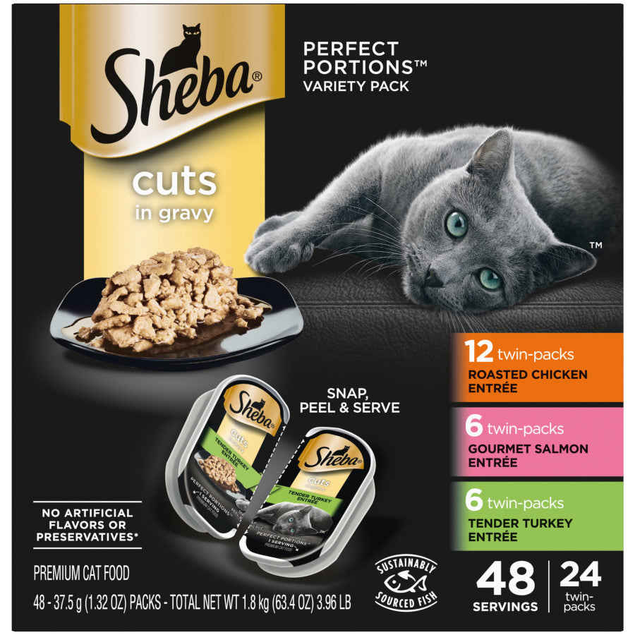 Sheba Perfect Portions Cuts in Gravy Wet Cat Food Variety Pack (Chicken, Salmon, Turkey), 24 Pack
