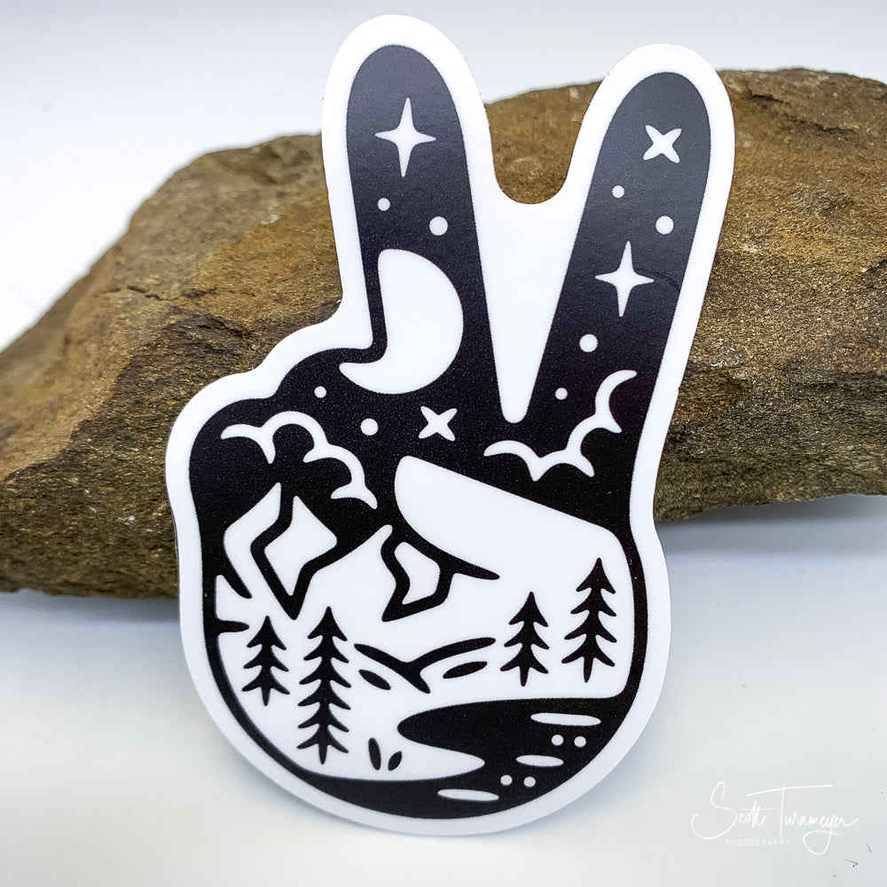 Peace Fingers Mountains and River Vinyl Sticker Decal