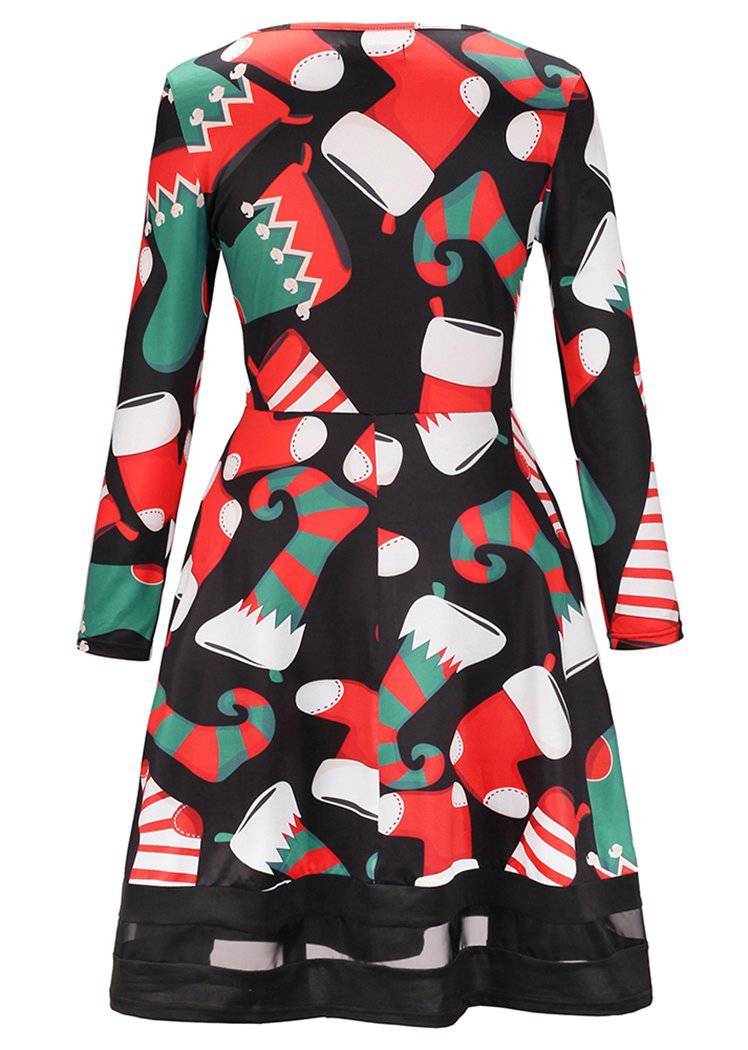 Fashion Christmas Stocking Print Hollow Front Long Sleeve Dresses For Women