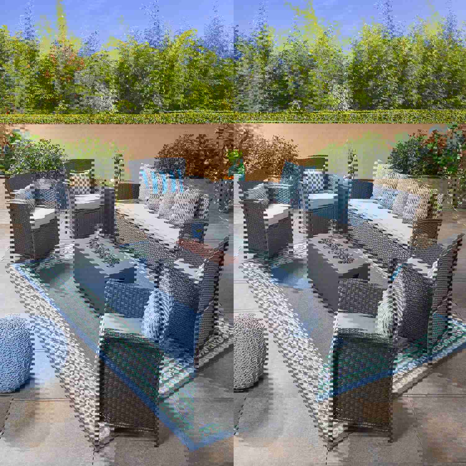 Outdoor 7 Seater Wicker Chat Set with Fire Pit, Gray and Dark Gray - NH503503