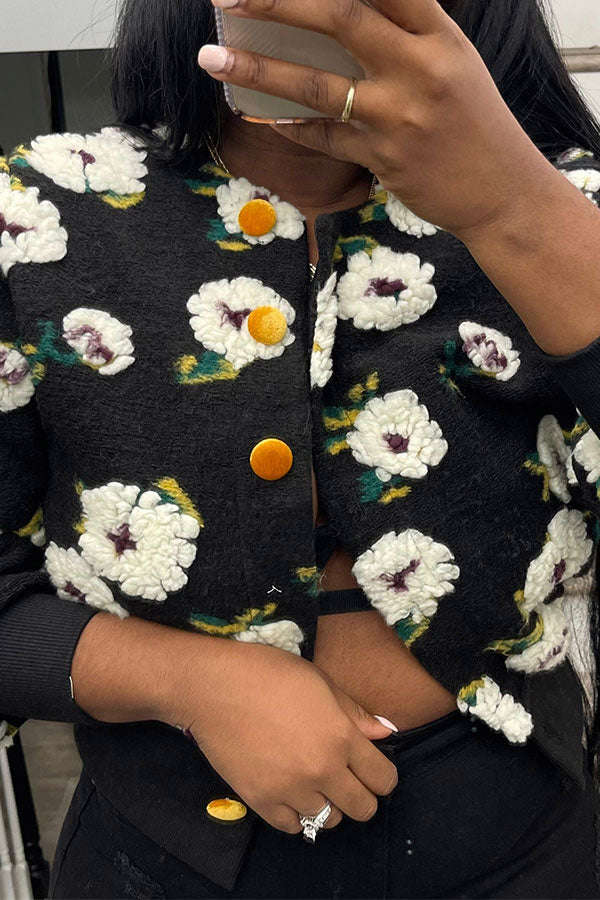 3D Flower Design Chic Button Thru Coat - Loose Fit Cotton Blend