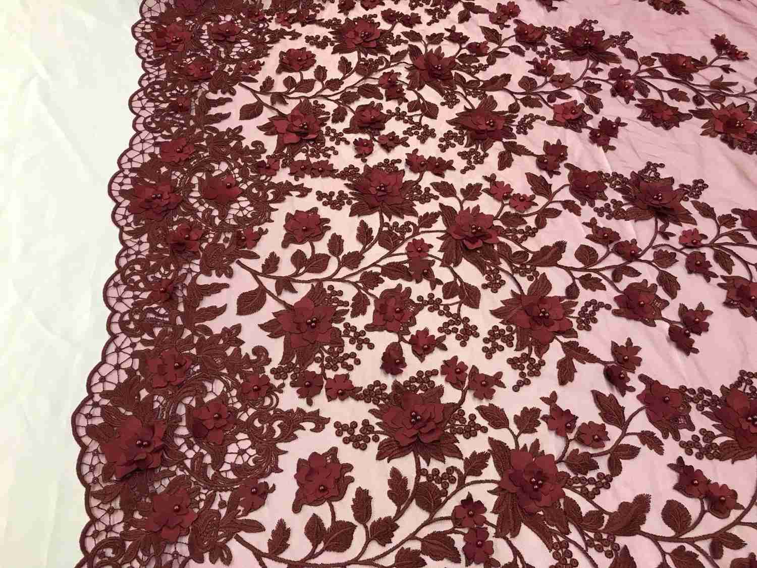 Burgundy 3D Floral Embroidered Mesh Lace with Pearls and Beads