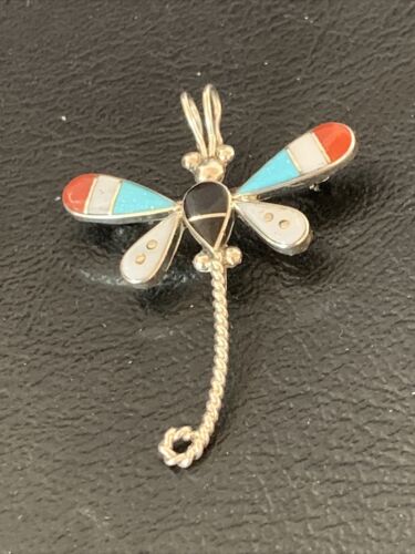 Zuni Turquoise White Mop Inlay Dragonfly Sterling Silver Necklace Pendant