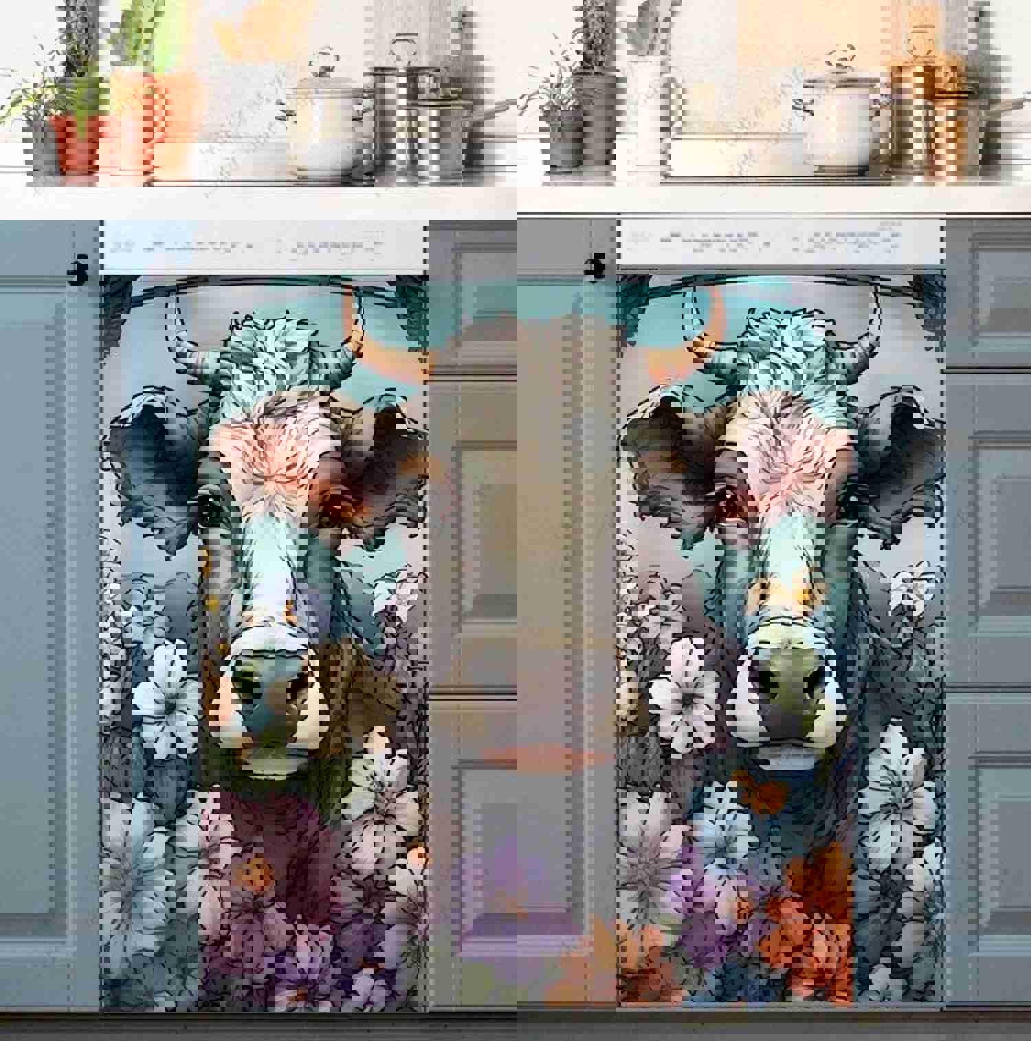 Cow And Flowers Dishwasher Magnet Cover - Decorative Kitchen Sticker