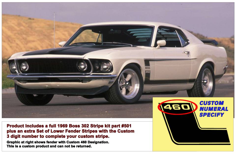 1969 Mustang Boss 302 Side and Trunk Stripe Decal Kit - Custom Numeral