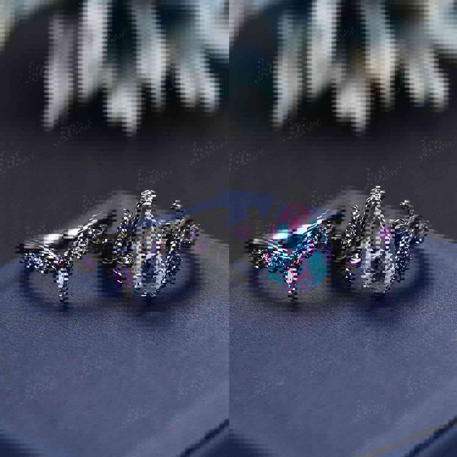 Gothic 14K Black Gold Color-Change Alexandrite Amethyst Bridal Set Nature Inspired Pear Wedding Ring Set for Women Unique Anniversary Gifts