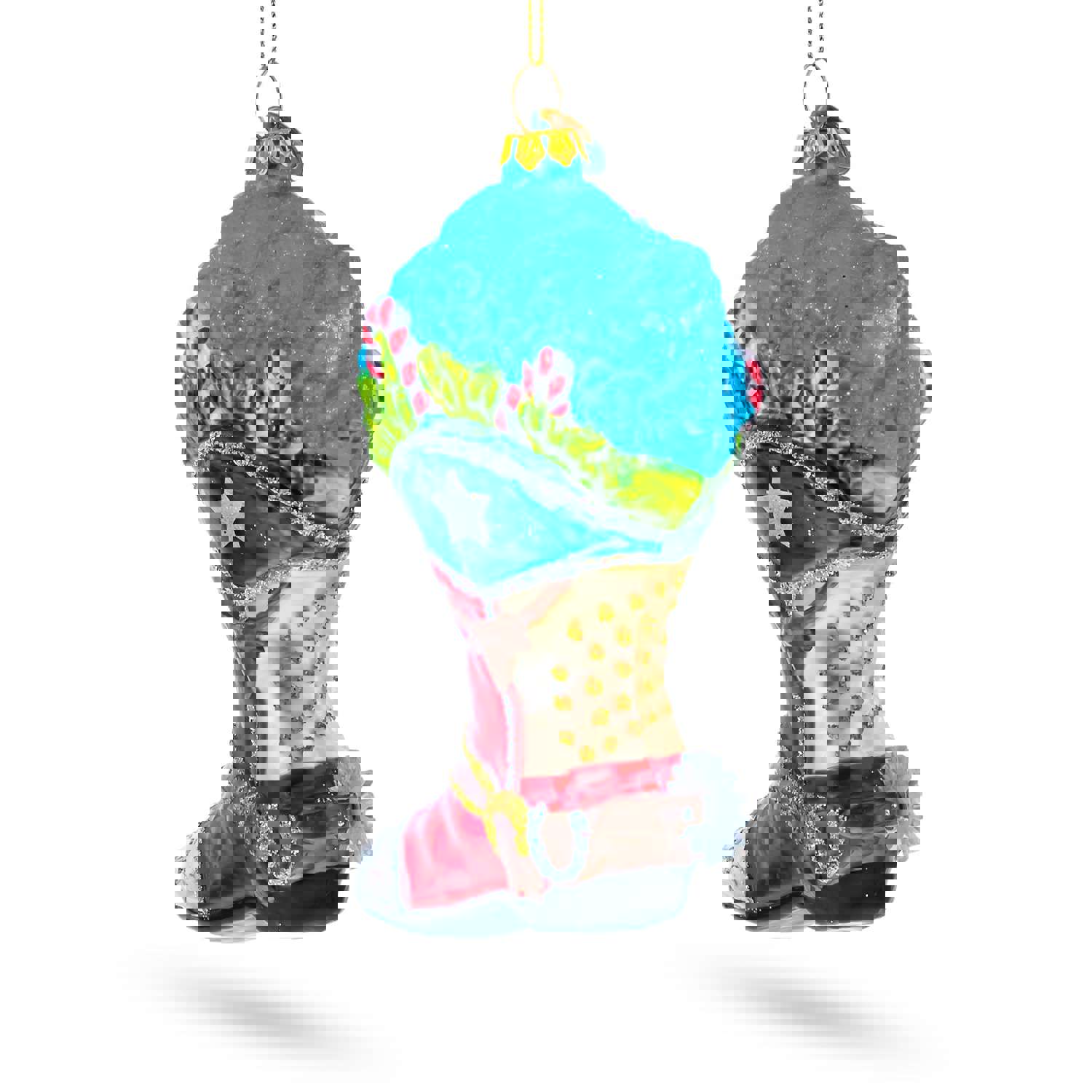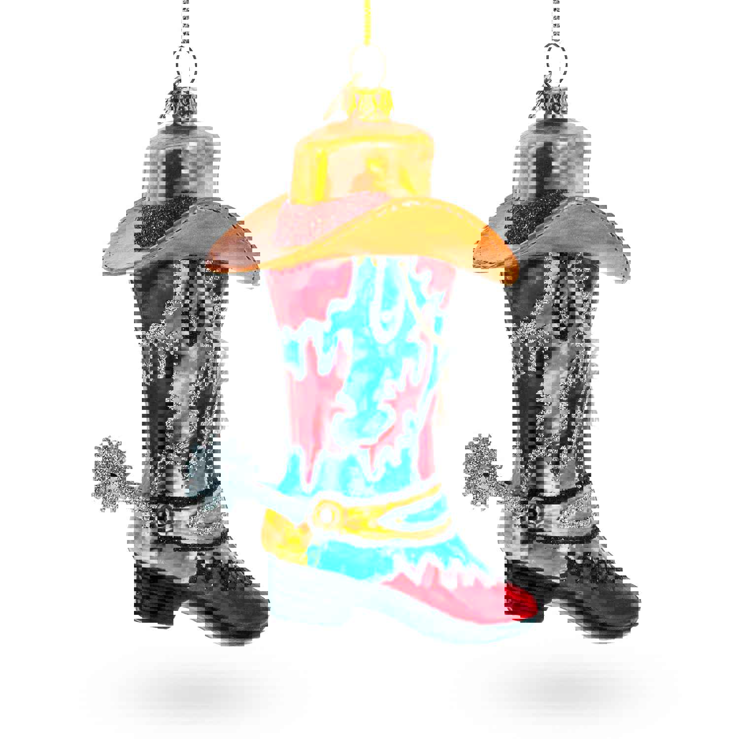 Western Cowboy Boot with a Hat Blown - Glass Christmas Ornament