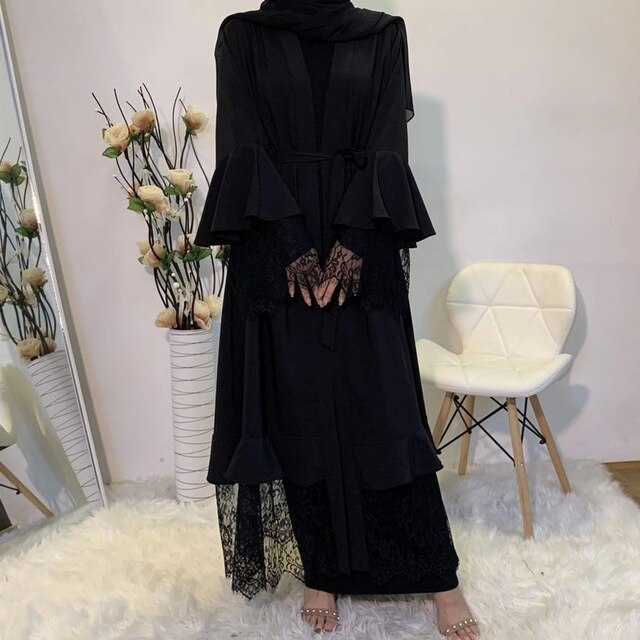 Elegant Women's Muslim Abaya Dress with Lace Detail - Arabic Turkish Kaftan for Party & Ramadan