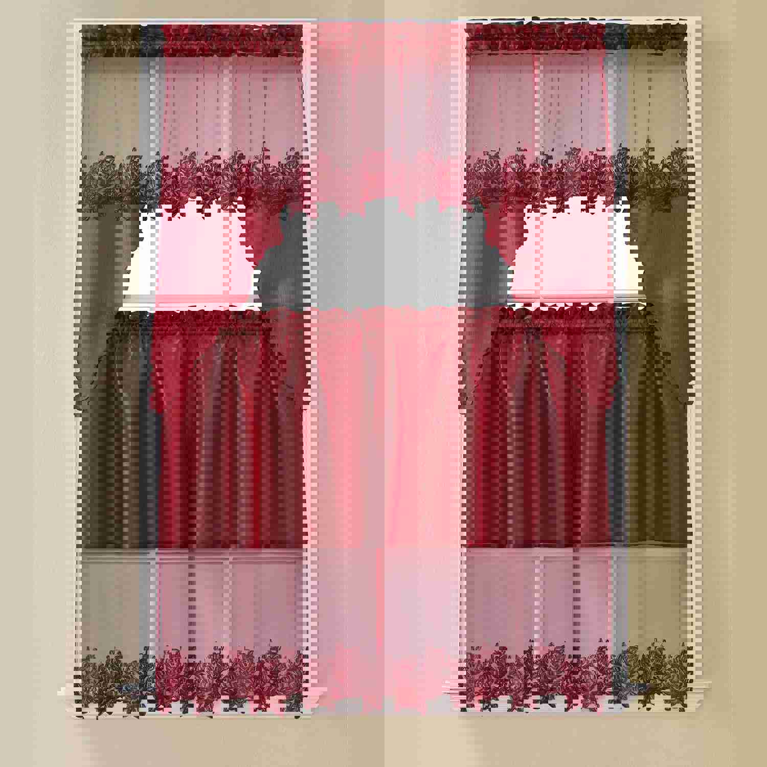 Sophia 3-Piece Embroidered Kitchen Curtain Set With Swag Valance, Burgundy, 60x36 Inches