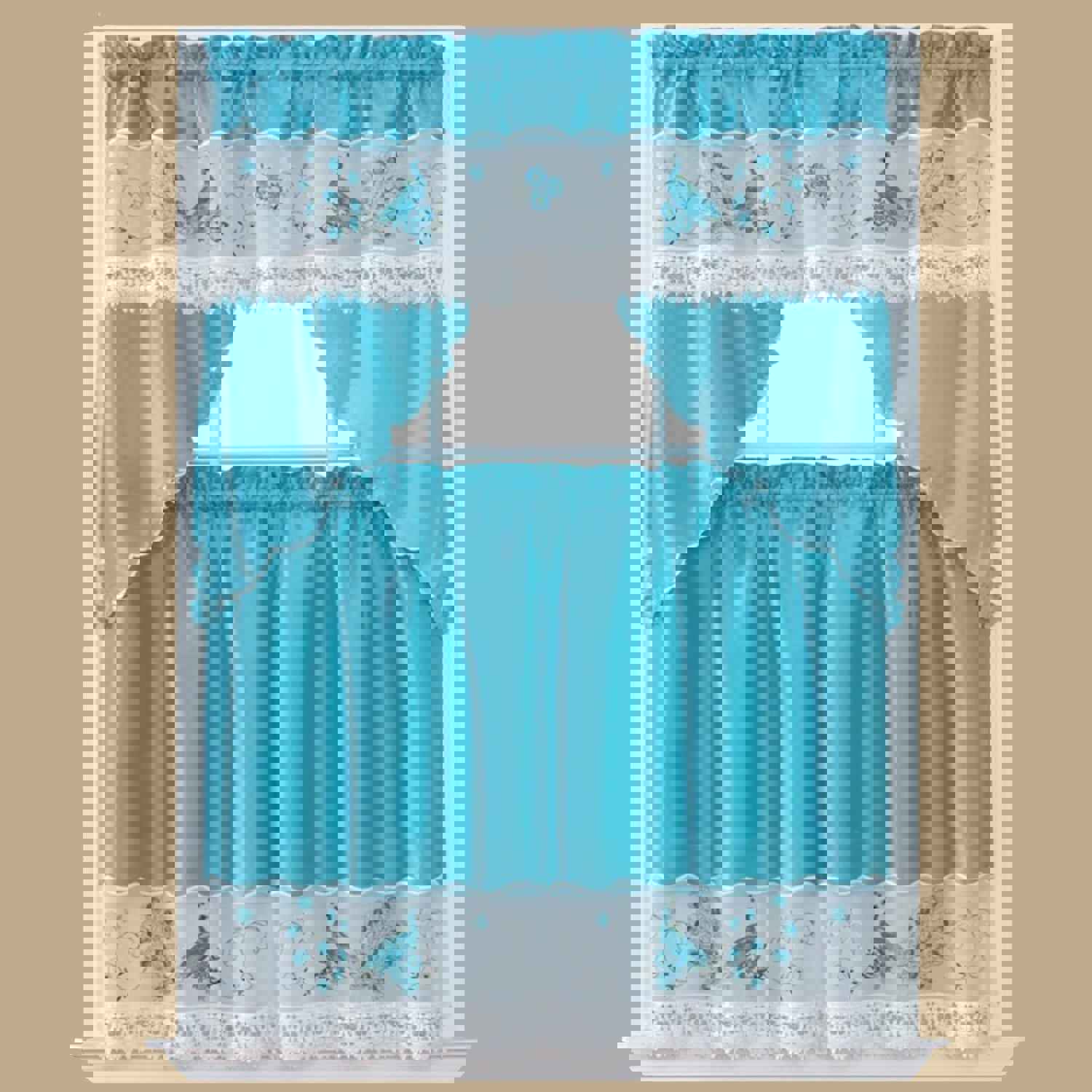Butterfly 3-Piece Embroidery Kitchen Curtain Set with Swag Valance, Blue, 30x36 Inches