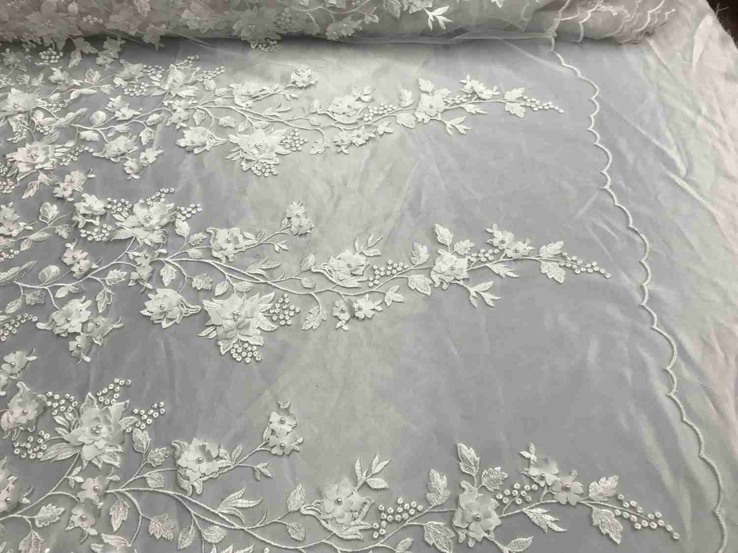 Ivory 3D Floral Embroidered Beaded Mesh Lace Fabric for Dresses and Decor