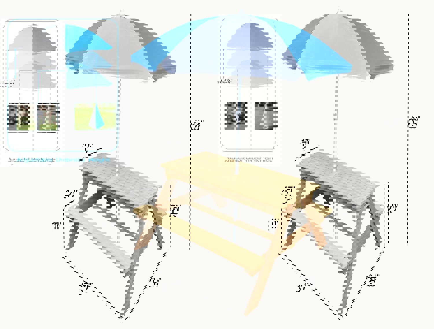 BTExpert Kids 3-in-1 Sand Water Activity Table Wooden Outdoor Convertible Picnic Table Bench with Adjustable Umbrella