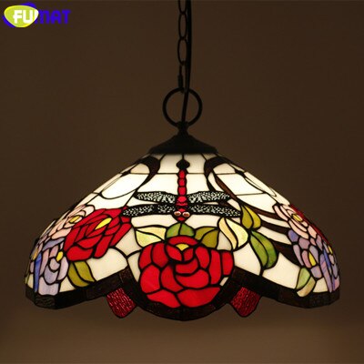 FUMAT Pink Rose Dragonfly Pendant Lamp - 16 Inches Tiffany Style Stained Glass LED Hanging Light