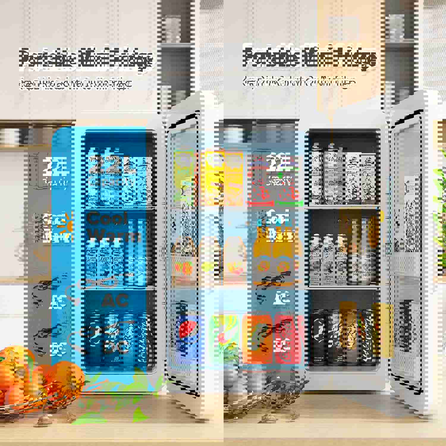 Kikihuose 22L/30Cans Mini Fridge for Bedroom, 12V DC Portable Cooler & Warmer, Small Beverage Refrigerator