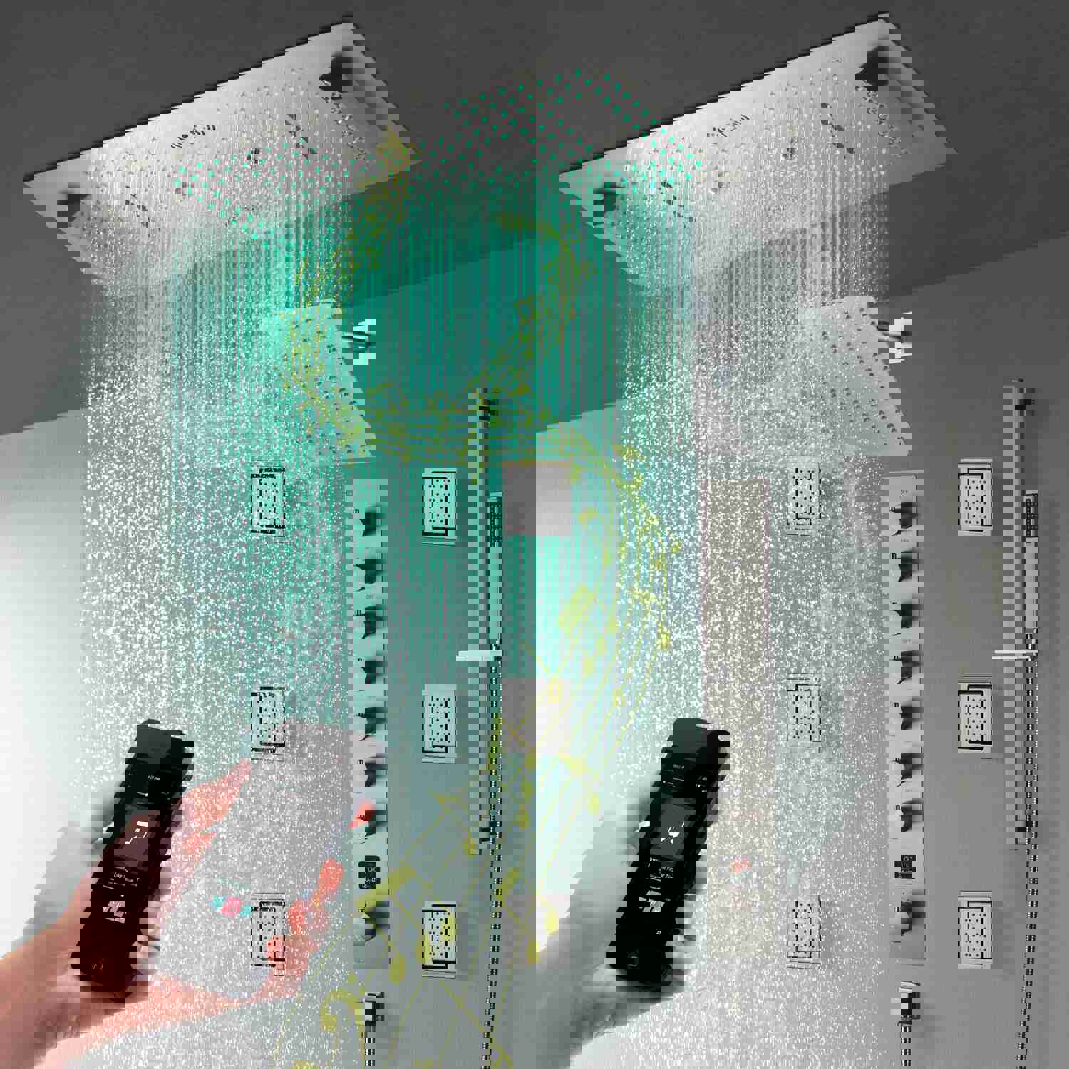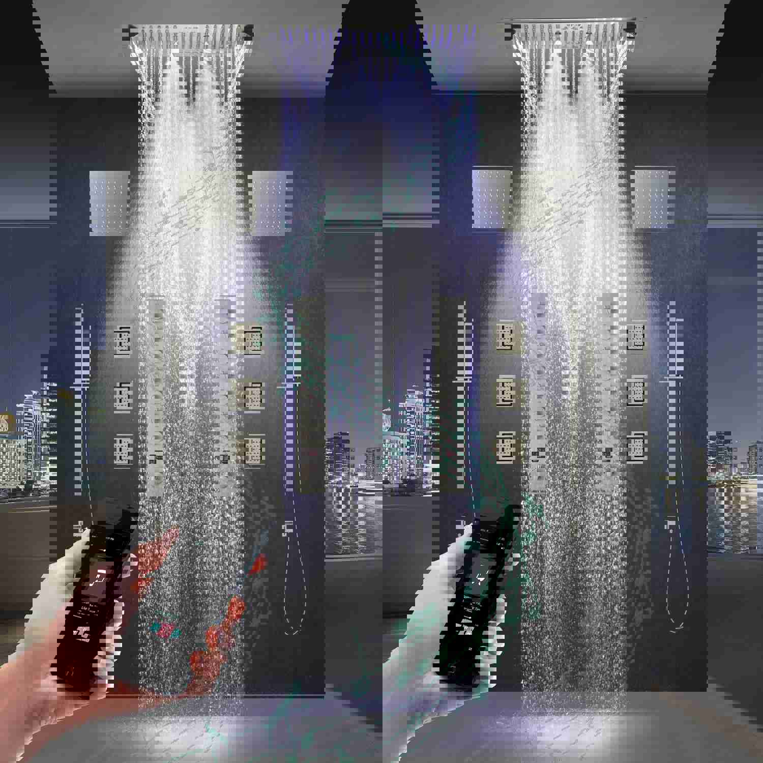 MONACO 20 x 20 Complete Luxury LED Music Shower Set with Rainfall, Waterfall, Mist Spray and 6 Body Jets