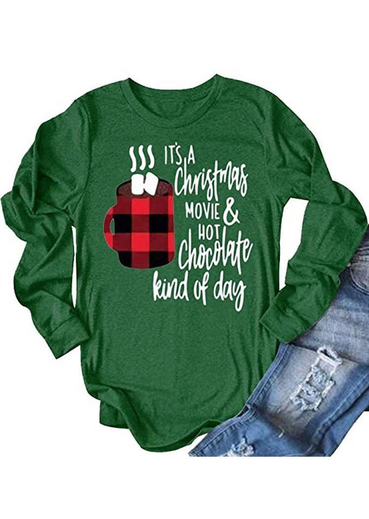 Fashion Christmas Tree Printing Red Plaid Long Sleeve Round Neck Pullover Tops for Women