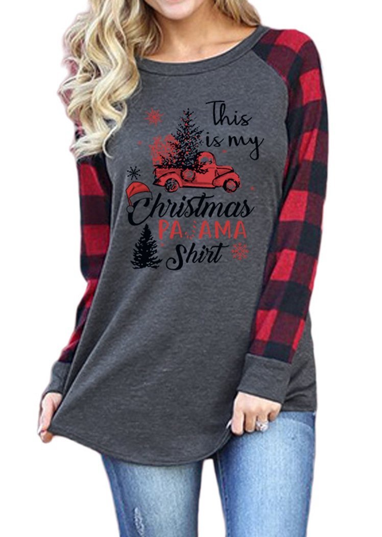 Fashion Gray Christmas Tree Printing Red Plaid Long Sleeve Round Neck Pullover Tops for Women