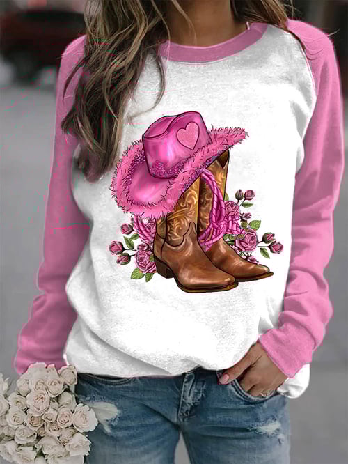 Cowgirl Hat & Boots Print Sweatshirt - Casual Long Sleeve Round Neck