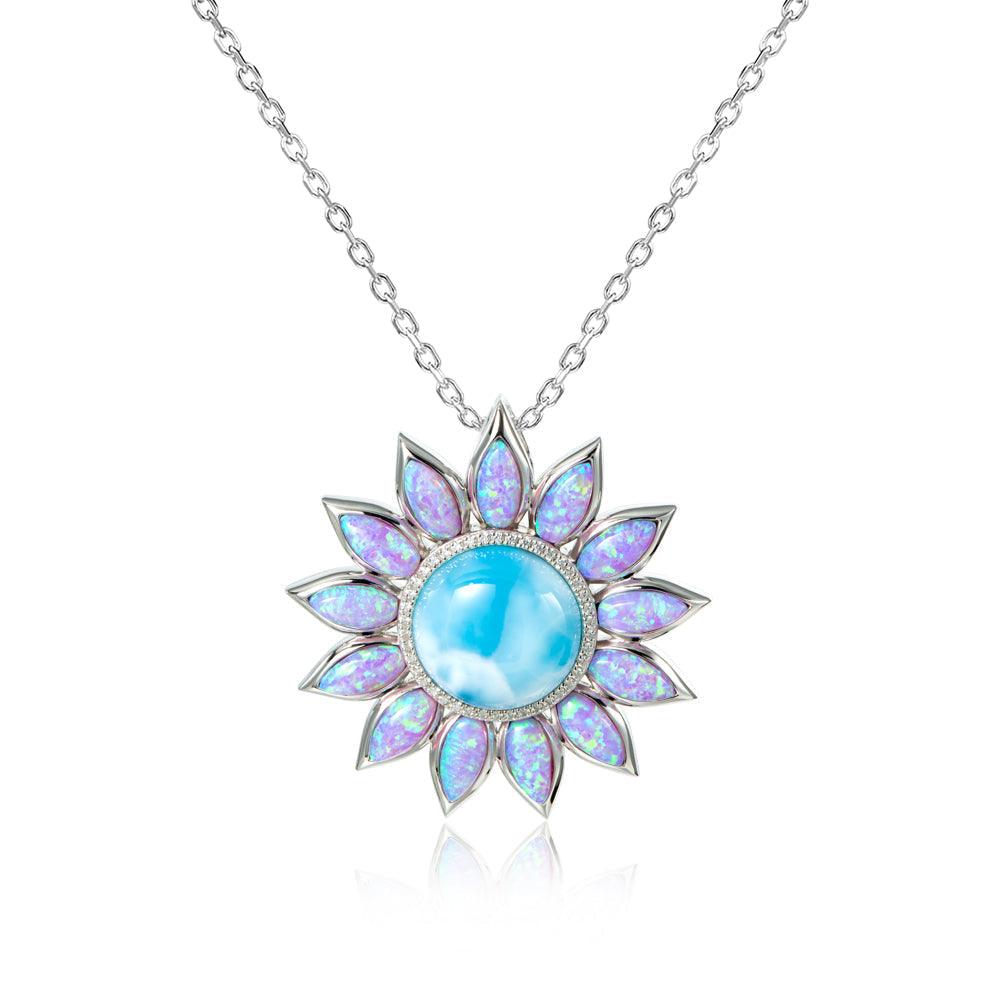 Pink Opal Sunflower Pendant with Larimar (Large) - 925 Sterling Silver Spiritual Jewelry